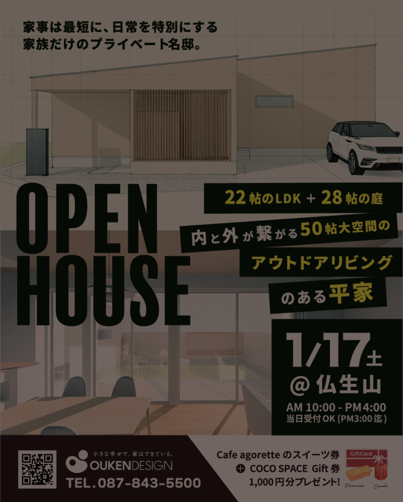 「22帖のLDK + 28帖の庭。」 内と外が繋がる、50帖の大空間アウトドアリビングのある平家。 10:00〜16:00(最終受付15:00)/@仏生山
