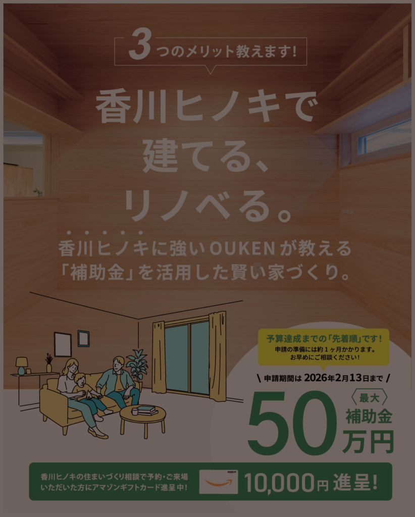 香川ヒノキで建てる、リノベる。香川ヒノキに強いOUKENが教える「助成金」を活用した賢い家づくり。