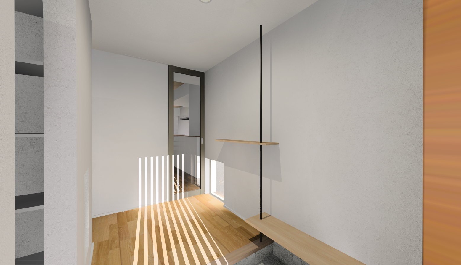 ○ 細部へのこだわり: 玄関の造作ベンチやR壁、外観を彩る木製格子が暮らしに彩りを。