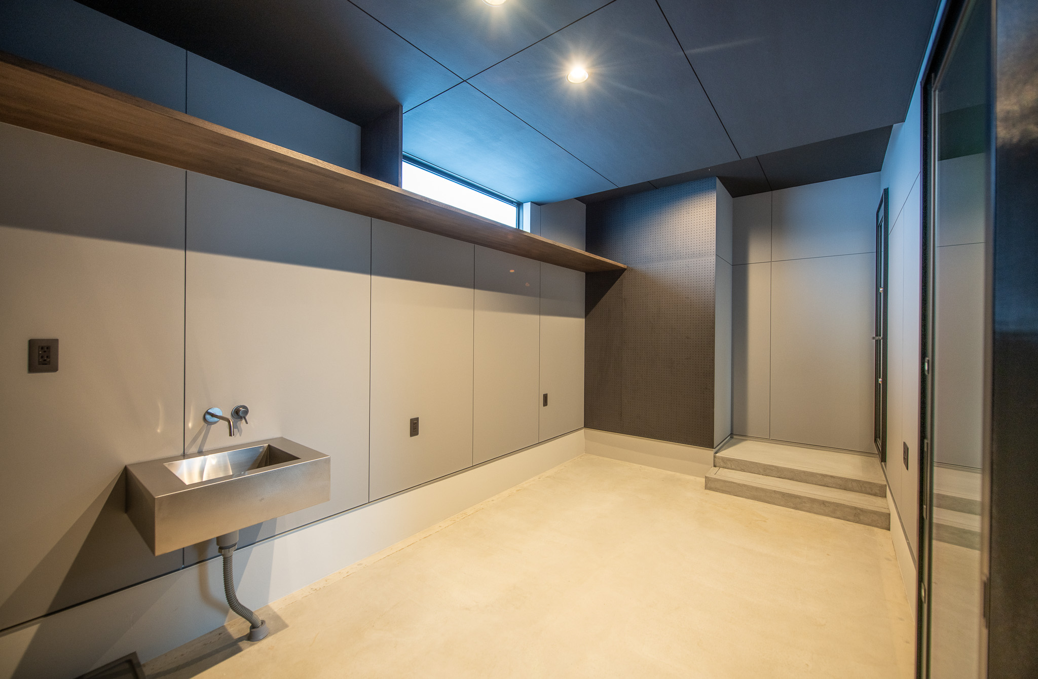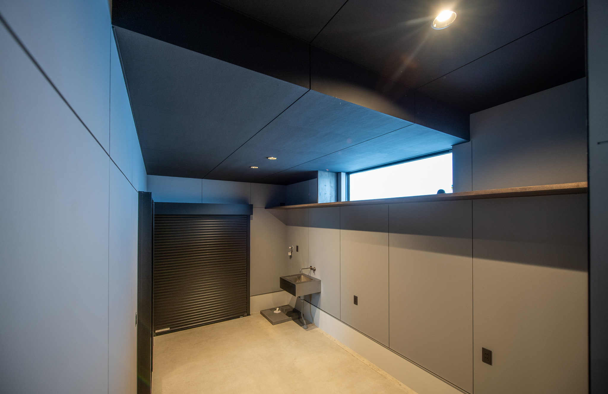 ・シンクや電源も完備し、バイクメンテナンスに重きを置いたガレージ。