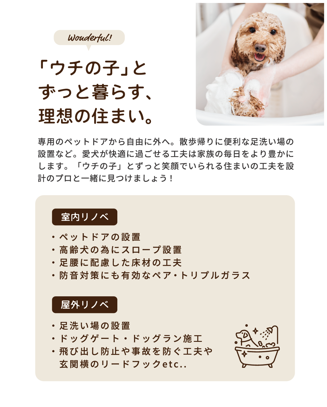 旺建は、わんちゃんの為の住まいづくりのご提案を行っています。