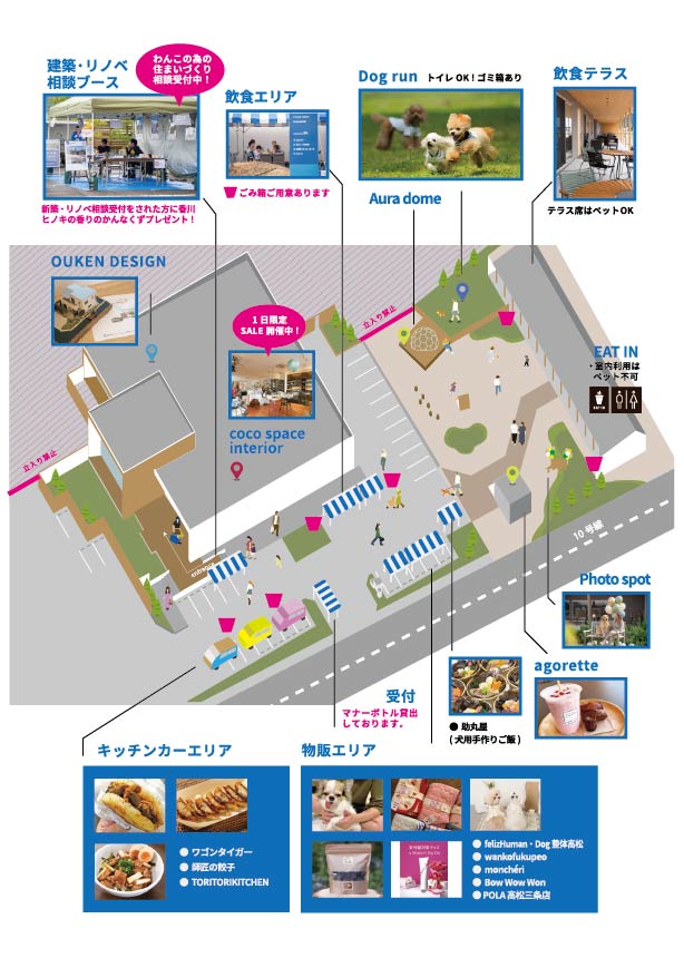 当日は、人気のキッチンカーやペット関連のショップが勢揃いするマルシェ、そしてわんちゃんがのびのび遊べるドッグランなど、一日中楽しめるコンテンツをご用意しております。
